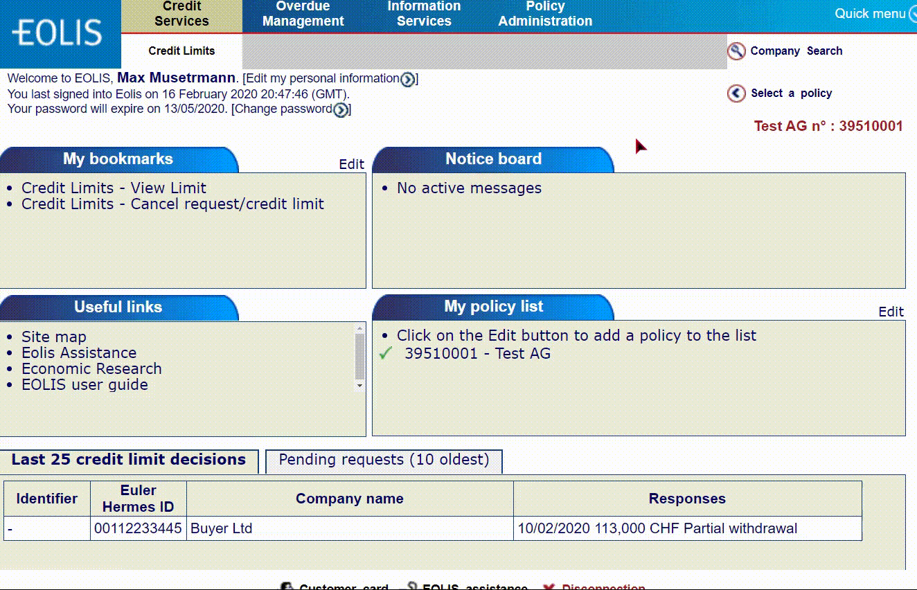 Select the customer either via the limit changes screen or by selecting “Report an overdue” in the quick menu in the top right corner. Or, if available, under “Last 25 decisions” on your main screen.