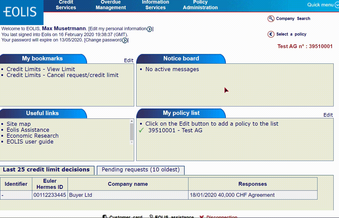 Select the customer either via the limit changes screen or by selecting “Report an overdue” in the quick menu in the top right corner. Or, if available, under “Last 25 decisions” on your main screen.