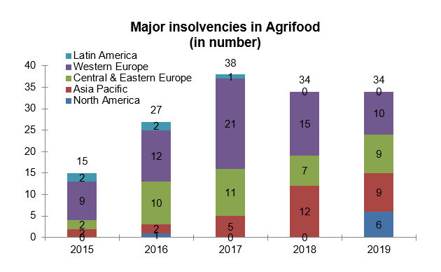 - Major insolvencies are on the rise in the global agrifood industry. At first glance, the global agrifood industry appears to be performing well, helped by the growing global population, especially in Asia. But since 2017, the sector has seen more than 30 major insolvencies on average per year, and the combined revenue of insolvent agrifood companies skyrocketed from USD6.4bn in 2018 to USD20bn in 2019.