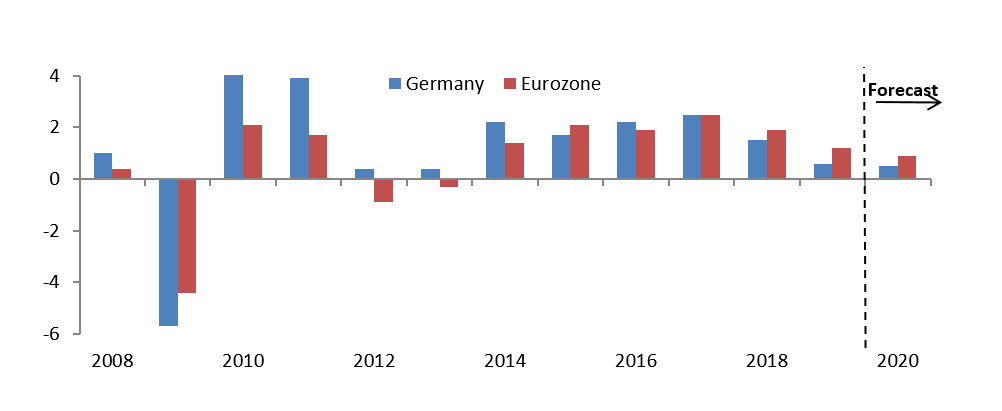 - Recession avoided in 2019, but no rebound on the cards for 2020. At +0.6%, about half the rate for the Eurozone as a whole, German GDP grew at the slowest pace since the region’s sovereign debt crisis. We do not expect 2020 to bring much relief with GDP growth likely to slow marginally to a seasonally-adjusted +0.5%. Moreover the risk that Germany’s “golden” decade of uninterrupted economic growth – the longest period of expansion since reunification – will come to an end in 2020 remains on the table for now, given the cautious outlook for global trade and the automotive industry as well as lingering elevated political uncertainty over trade and Brexit.