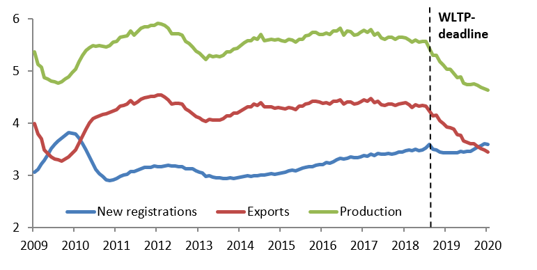 After four consecutive years of strong economic growth above the potential rate, the high-flying German economy experienced a sharp deceleration in momentum in 2018. The combination of some key characteristics of Europe’s largest economy – including its export-dependence, geographic export concentration (China, Italy and the UK account for almost 20% of exports) and large share of gross value added accounted for by industry – proved highly unfavorable in an environment of slowing global momentum and elevated political uncertainty. In addition, the dominance of the automotive sector turned from a core strength to major vulnerability, as production registered a marked setback, thanks to a homemade regulatory shock related to stricter emissions norms.