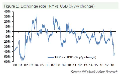 In May 2018, Turkey faced a first strong storm as fading investor confidence resulted in a considerable sell-off of the Turkish lira (TRY, -10% vs. the USD during the month) triggered by a range of weak data and increased concerns about the independence of the Central Bank of the Republic of Turkey (CBRT) especially with regard to monetary policy. Only a 300bp hike of the late liquidity window lending rate (at the time the effective policy rate) in an emergency meeting of the CBRT could stabilize the currency temporarily, though daily volatility remained high.