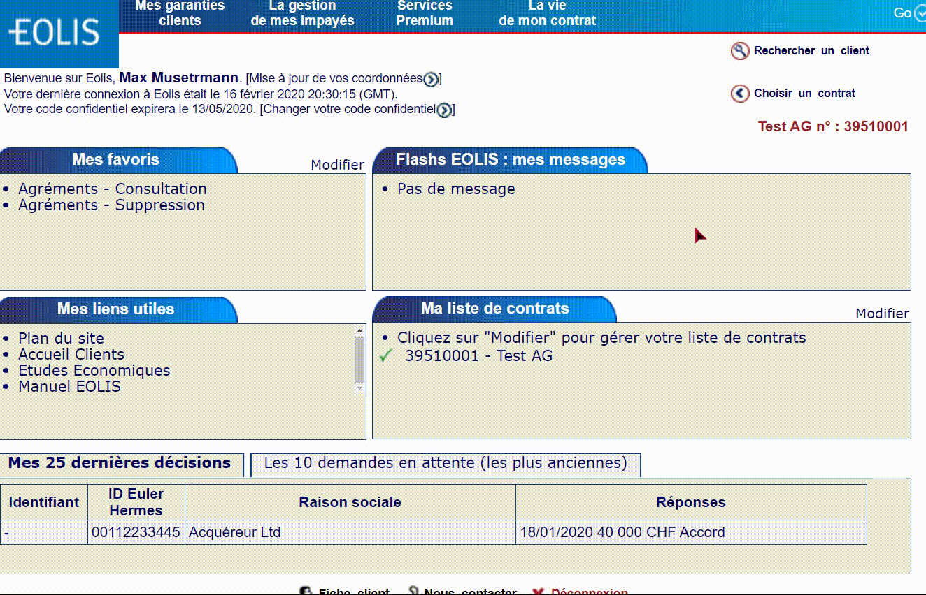 Sélectionnez le client recherché, soit via la fenêtre consacrée aux ajustements de limite, dans le menu rapide, en haut à droite, « Déclaration de non-paiement », soit le cas échéant, « 25 dernières décisions » dans la fenêtre principale.