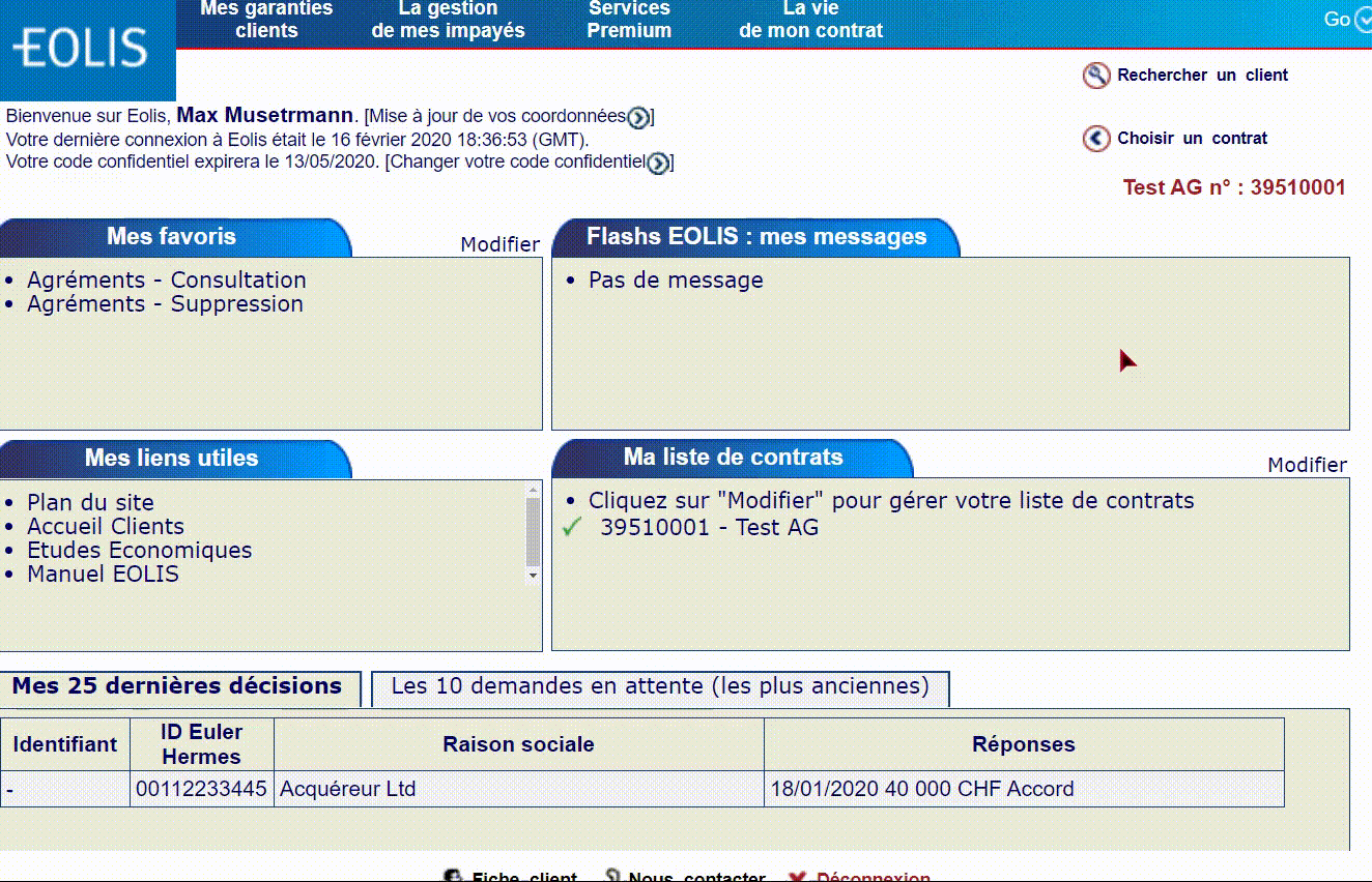 Sélectionnez le client recherché, soit via la fenêtre consacrée aux ajustements de limite, dans le menu rapide, en haut à droite, « Déclaration de non-paiement », soit le cas échéant, « 25 dernières décisions » dans la fenêtre principale.