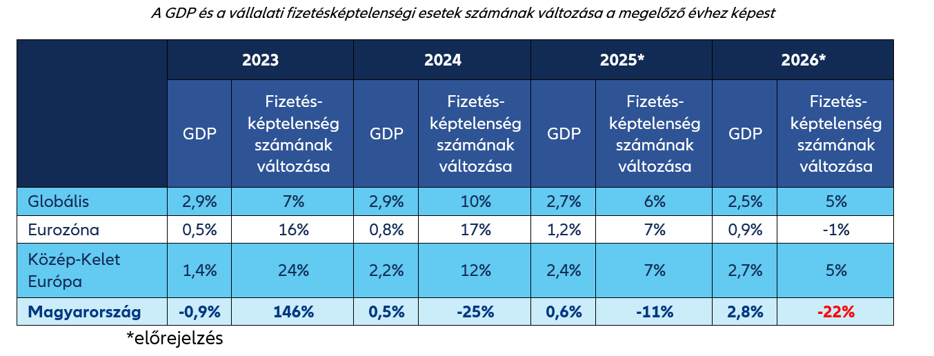 - A 2025-ös globális 2,7 százalékos GDP növekedést követően 2026-ban 2,5 százalékos mérsékelt bővülés várható. Az eurózóna továbbra is döcög: idén 1,2 százalék, míg 2026-ban mindössze 0,9 százalék GDP-változást vár az Allianz Trade kockázatkezelési igazgatója, ami nem elegendő a fizetésképtelenségek stabilizálásához. Magyarország GDP-je 2025-ben legfeljebb 0,6 százalékkal nőhet, és mindemellett az ipari termelés több mint három éve zsugorodik. A választási év ellenére - az államháztartási hiányt is figyelembe véve - a gazdasági dinamika hazánkban várhatóan javuló, de mérsékelt marad 2026-ban is: 2026-ra 2,8 százalékos növekedést prognosztizál a hitelbiztosító szakértője, melynek oka szerinte az, hogy az ipari beruházások csak lassan hoznak felfutást, az export pedig többek között a német gépjárműipar alakulásának a függvénye.
