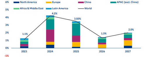 Svetová ekonomika bude v nasledujúcich dvoch rokoch čeliť kombinácii geopolitickej neistoty, fiškálnych obmedzení a pretrvávajúcich štrukturálnych problémov. Napriek tomu analytici z Allianz Trade očakávajú pokračovanie mierneho, no stabilného rastu globálneho hospodárstva. „Globálny rast HDP by sa mal v rokoch 2026 a 2027 pohybovať pod hranicou 3 %, čo potvrdzuje trend posledných rokov. Zatiaľ čo vyspelé ekonomiky budú rásť pomalším tempom, rozvíjajúce sa trhy si udržia vyššiu dynamiku. Ťahúňmi zostávajú India a Čína,“ hovorí Peter Mucina, riaditeľ poisťovne pohľadávok Allianz Trade na Slovensku.