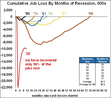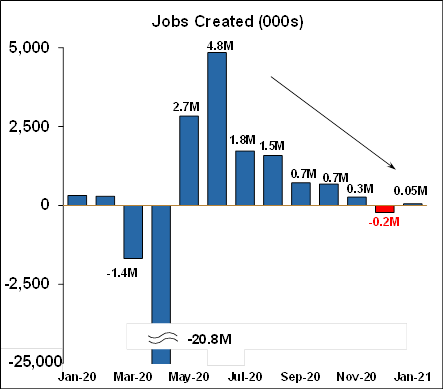 The economy created +49k jobs in January 2021, right around expectations. However, the report was not nearly as strong as it looked as there were two nasty revisions. The job loss in December, which had been previously reported as -140k, was revised down to an ugly -227k, and the November gain was revised down another -72k. So, there was a total downward revision over the two months of -159k, clearly outweighing January’s +49k gain. After the February 5th report, the economy has recovered 55.8% of the jobs lost in March and April of 2020. But back in November, the economy had recovered 56.6%; we’ve actually lost ground. We still have 9.9 million fewer jobs in the economy than before vile COVID reared its ugly head.