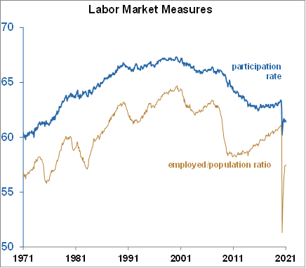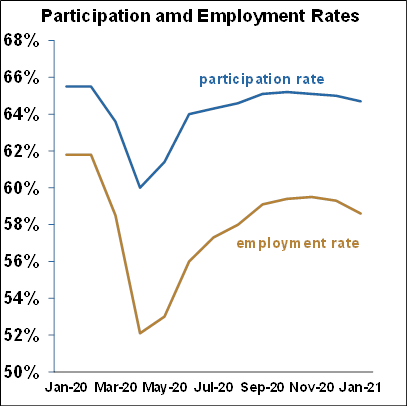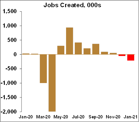 There were small but unexpected losses in construction and manufacturing of -3k and -10k, respectively. Transportation and warehousing jobs fell -28k after December’s -24k, perhaps due to post-holiday layoffs. But once again, it was shutdowns and restrictions that drove larger losses of -38k in retailing and -61k in leisure and hospitality, after a devastating loss of -536k in December. Significant gains came in government at +43k, and of course in professional and business services at +97k – this category almost always has one of the biggest gains since it’s one of the biggest categories.