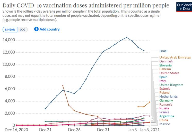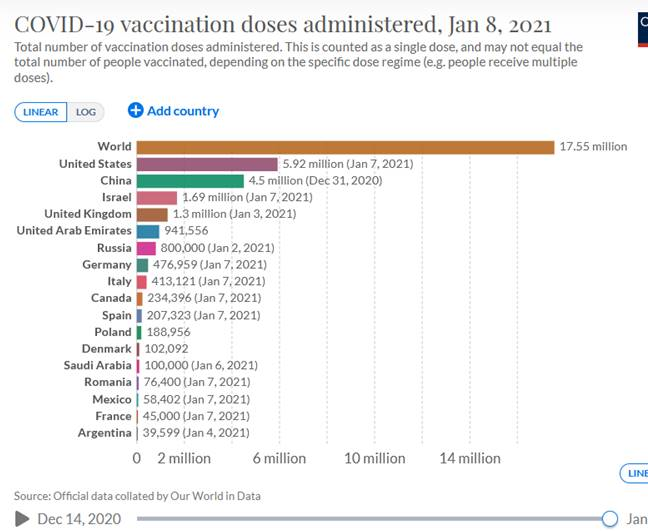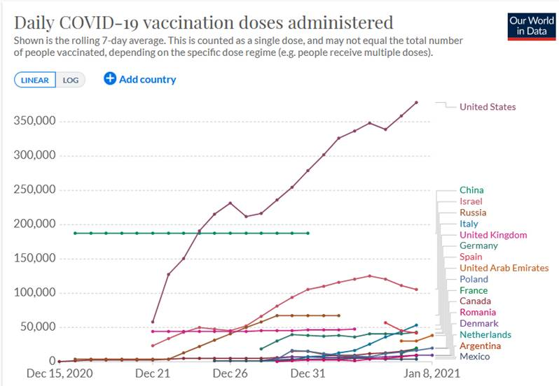 So let’s look at how the rollout is going. The first chart shows that the U.S. has administered 5.92 million doses – more than any other country.