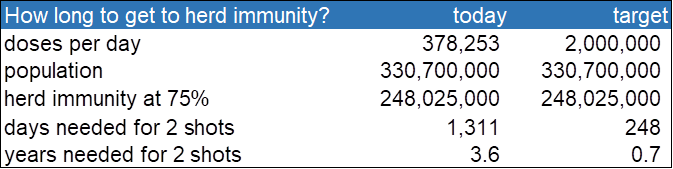 So how long will it take us to get “there” – to herd immunity? Here are some calculations which assume that we need 75% of the population to get 2 shots to reach herd immunity. I’m not a health expert and I don’t know if those assumptions are good ones, but the exercise is useful nonetheless. The first column shows that at the current rate of 378,253 shots given per day, it will take us 3.6 years to reach herd immunity. However if today (January 8th) we were to ramp up the rate to 2,000,000 shots per day, we could reach herd immunity in 0.7 years. In a rare bit of optimism, I am hopeful that we can do this.