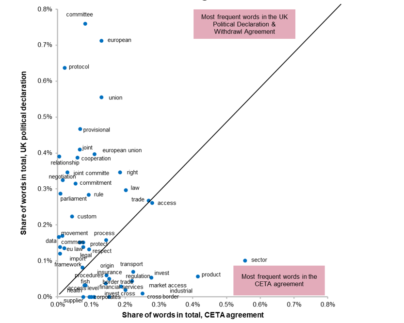 Looking at the calendar (see Figure 1 below), we expect the debate to quickly shift to the risks of a “no trade deal” situation at end-2020. Even if PM Boris Johnson does not want to extend the transition period beyond the fixed date into UK law, we think there is a high probability that he will have to do so in the end. Indeed, the European Commission remains skeptical of both parties’ ability to negotiate a “new comprehensive agreement” by the European Summit on 18-19 June that would include goods and agriculture products, as well as services, while obeying EU requests in terms of social and environmental norms, state aid, fraud control and labor standards. In our view, the most challenging would be the technical set-up of the custom checks in the Irish Sea (see report here). Also, financial services would lose passporting rights and therefore would need the equivalent status product by product. The negotiations will officially start on 01 March and the technical details are clearly not yet stated in the Political Declaration, nor in the Withdrawal Agreement. When comparing the latter to the Comprehensive Economic and Trade Agreement (CETA) between the EU and Canada, for example, it still lacks concrete words such as “sectors”, “industrial”, “financial services”, “corporates”, “market access” etc. – see Figure 2.