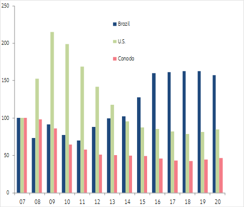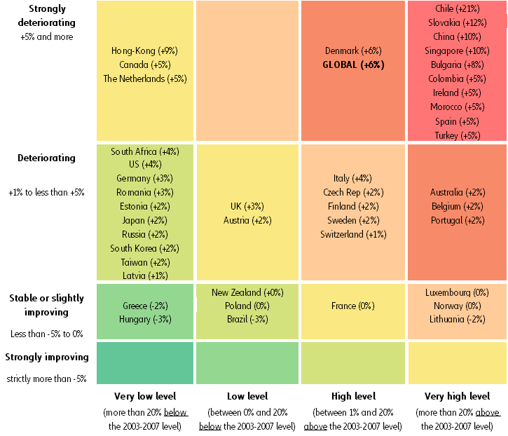 In 2020, we expect four out of five countries to register an increase (compared to 2 out of 3 in 2019) in insolvencies. We also expect one out of two countries to record more insolvencies than registered on average over the 2003-2007 period, prior to the financial crisis of 2008. Countries which exhibited dynamic business creation over the past years would face an extra volume of insolvencies due to the number of young companies too weak to survive.
