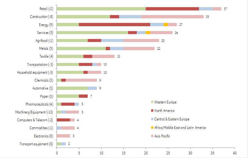 The risk of major insolvencies also remains high. Indeed, the first three quarters of 2O19 pointed to another batch of 249 insolvencies of major companies – namely those with over EUR50mn of turnover. This represents a relatively stable number of cases compared to the same period of 2018 (+1) but still a worsening severity in terms of cumulative turnover (+ EUR39.1bn to EUR145.2bn), which could have serious domino effects on providers along supply chains. In this regard, retail (with 37 major insolvencies over Q1-Q3), construction (33) and services (27) were the most concerned sectors in 2019, and Western Europe (104), Asia (64) and North America (51) the most impacted regions (For more details).